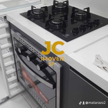 O imóvel possui armários embutidos, fogão embutido, piso em porcelanato e iluminação em LED.